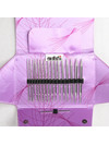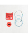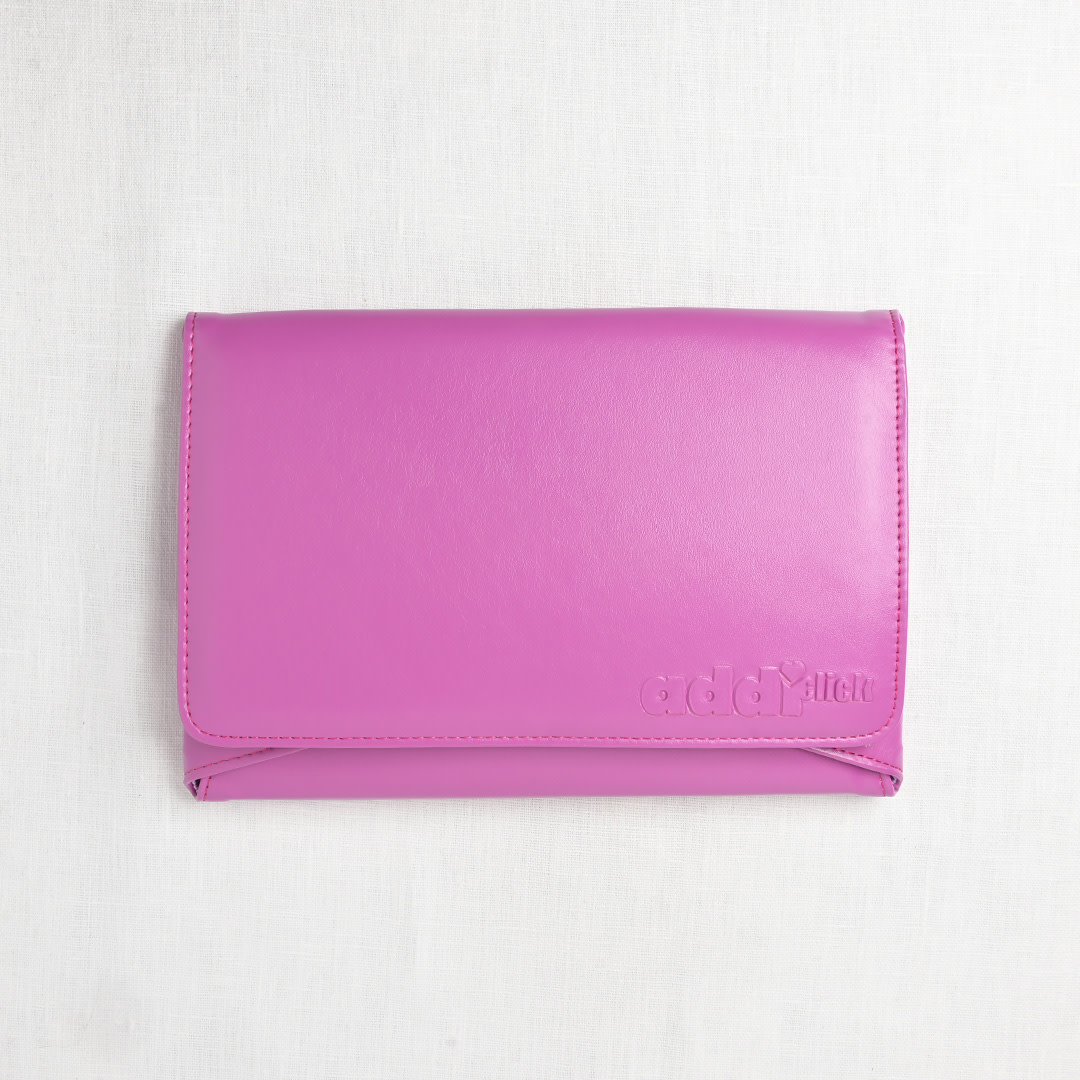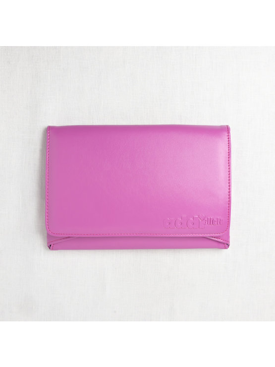 Set includes eight sets of interchangeable tips (5” length) in size US 4, 5, 6, 7, 8, 9, 10, 11 (3.5-8mm), one 24” cord, one 32” cord, one 40” cord, one Click Connector to store stitches or combine cords, one addiGrip to make changing tips even easier, one addi needle gauge, premium pink storage case with multi-snap closure.