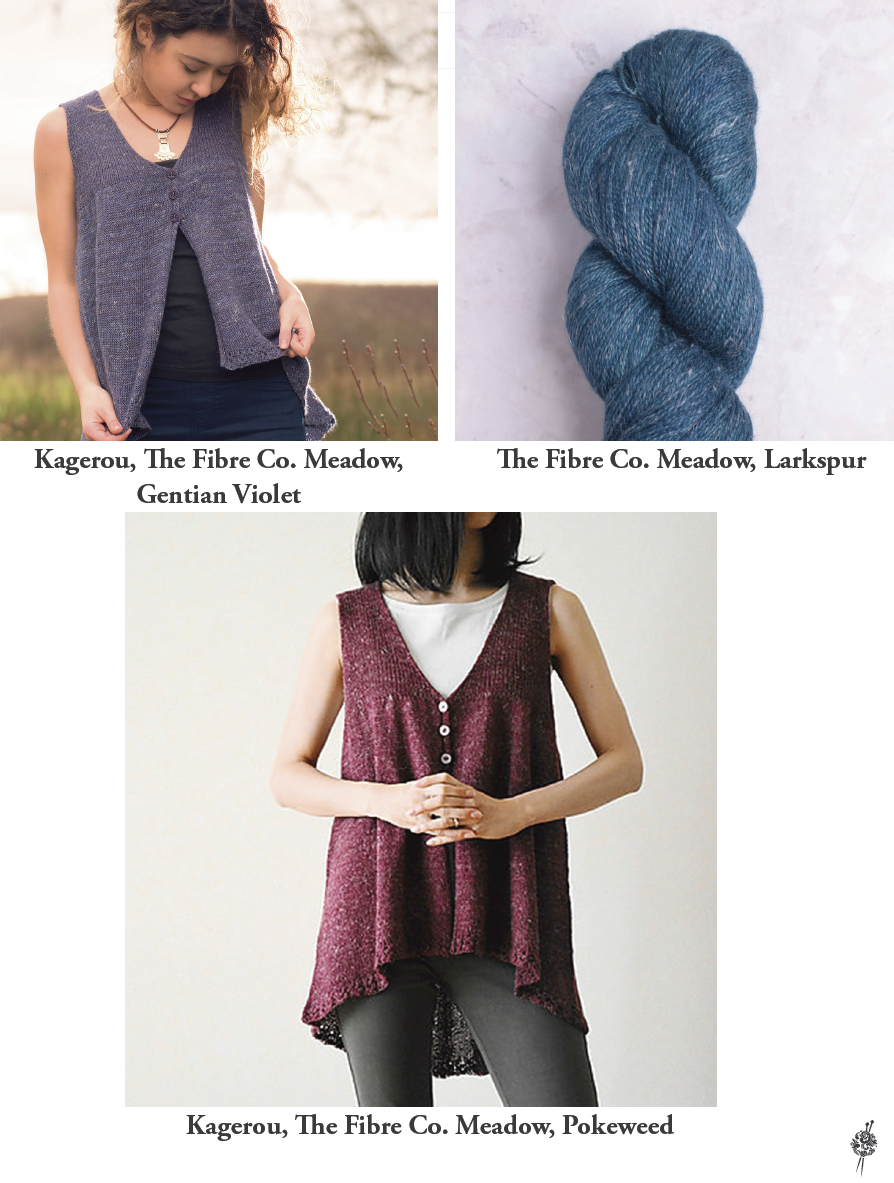 Knit from the bottom-up, the open front vest is knit in The Fibre Co. Meadow, a blend of Merino wool, baby llama, silk, & linen. The linen fibers gives this soft & textured yarn a relaxed, “lived-in” look.