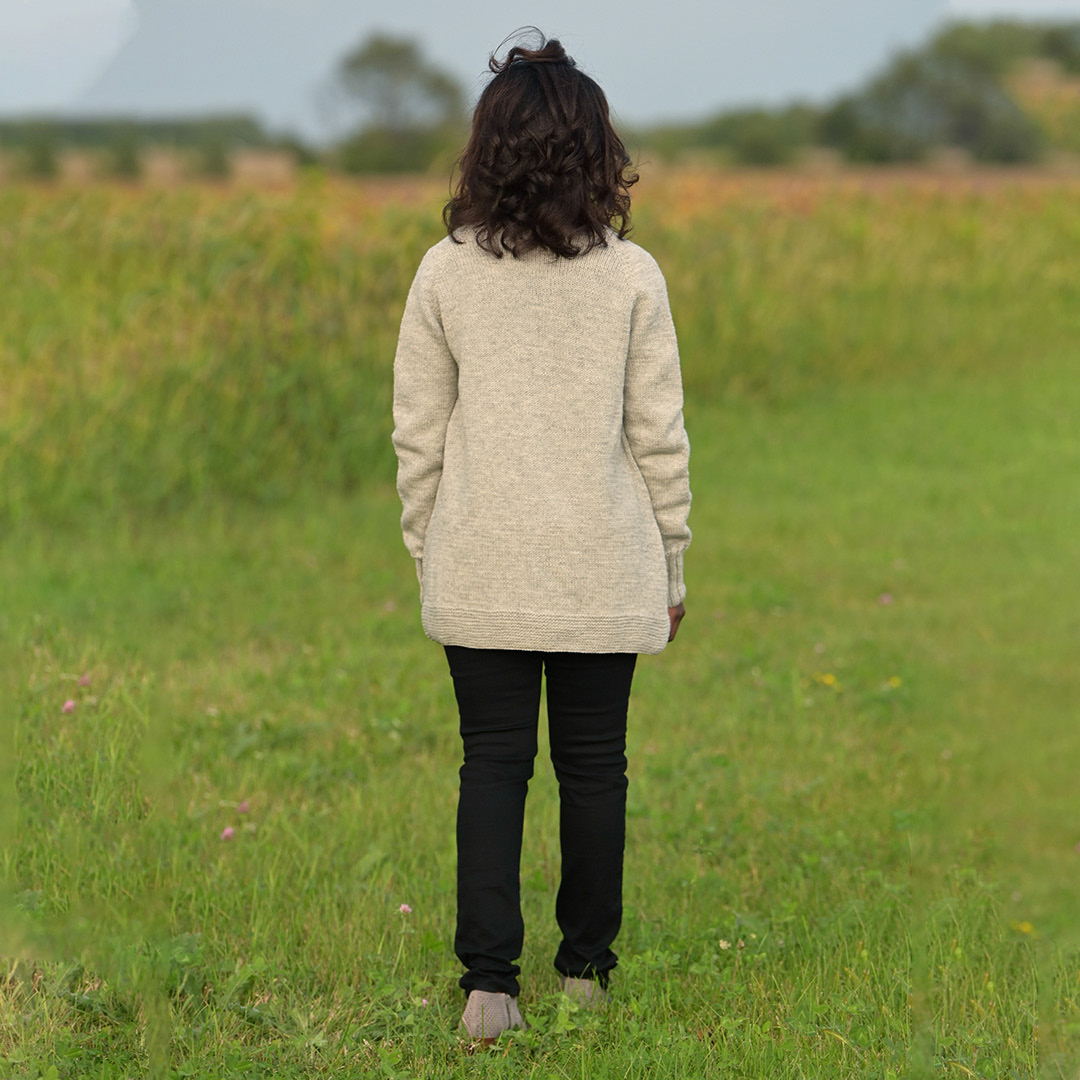 We chose Quince & Co. Lark in Iceland, a light, heathered grey, for our sample. Worsted weight Lark is 100% American wool that is spun & dyed in the U.S. The wool has a soft, lived-in feel that we love. The sample was knit & modeled by Elizabeth, one of our lovely, talented cast members.
