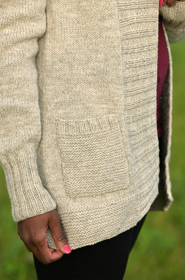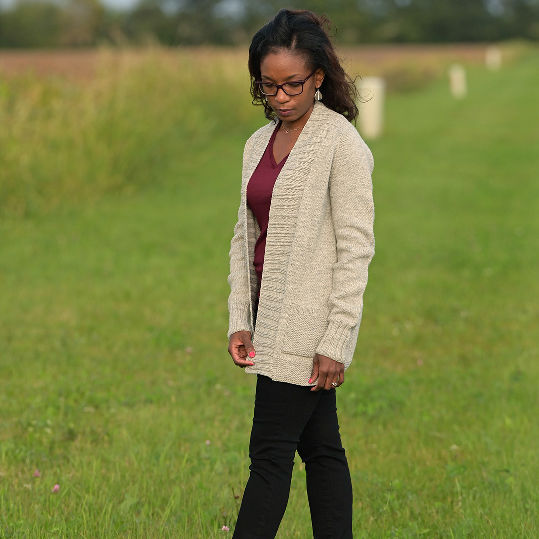 Everyone needs that perfect, go-to knit cardigan that is akin to being wrapped in a soft hug. The Lillian by Carrie Bostick Hoge features a flattering shawl collar & two handy pockets. Simple, yet beautiful, the stockinette cardigan has ribbed cuffs, a thick, ribbed shawl collar & garter stitch pockets. It looks great on everyone!