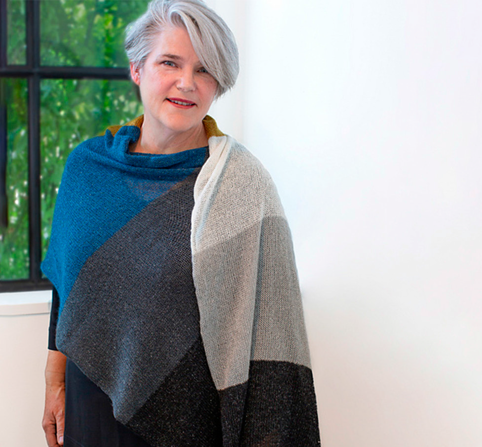 Knit with luxurious, textured Shibui Tweed Silk Cloud, the wrap requires one skein each of 7 colors of Tweed Silk Cloud & size US 6, 24” or 32” circulars (piece is 28” wide, knit flat).