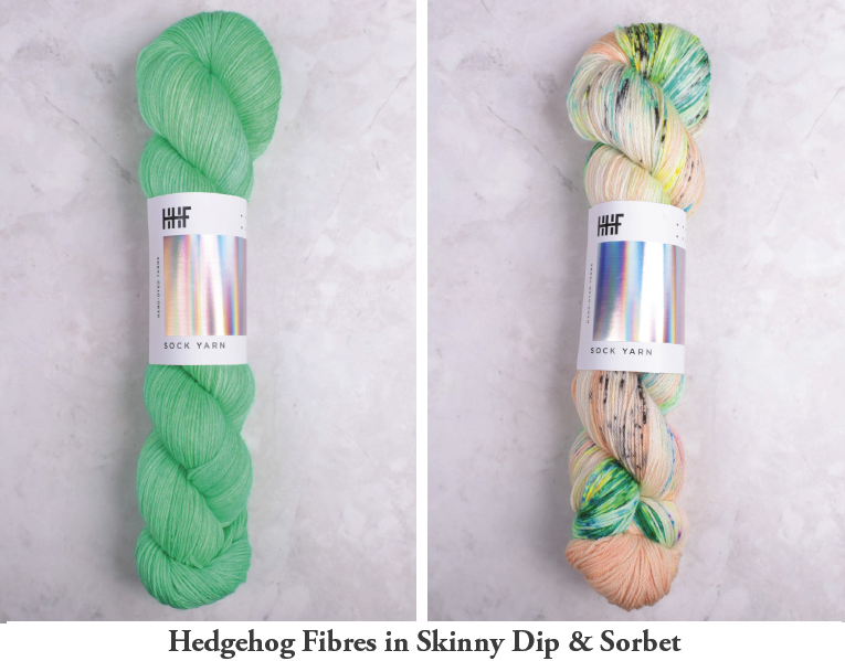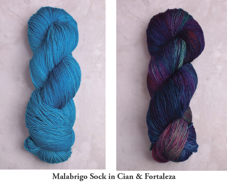 include Malabrigo Sock, Malabrigo Mechita, Hedgehog Fibres Sock, Madelinetosh Tosh Merino Light, Madelinetosh Twist Light, or Leading Men Show Stopper.