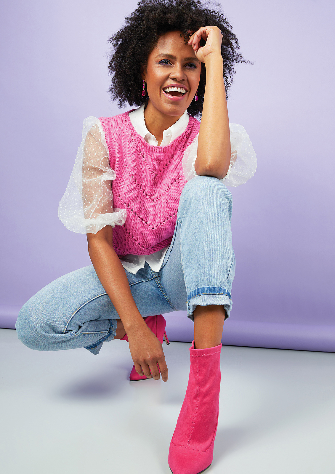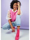 There are two lengths featured. The shorter, cropped length is photographed in Flamingo (pink) and the longer length is in the Gooseberry (green).