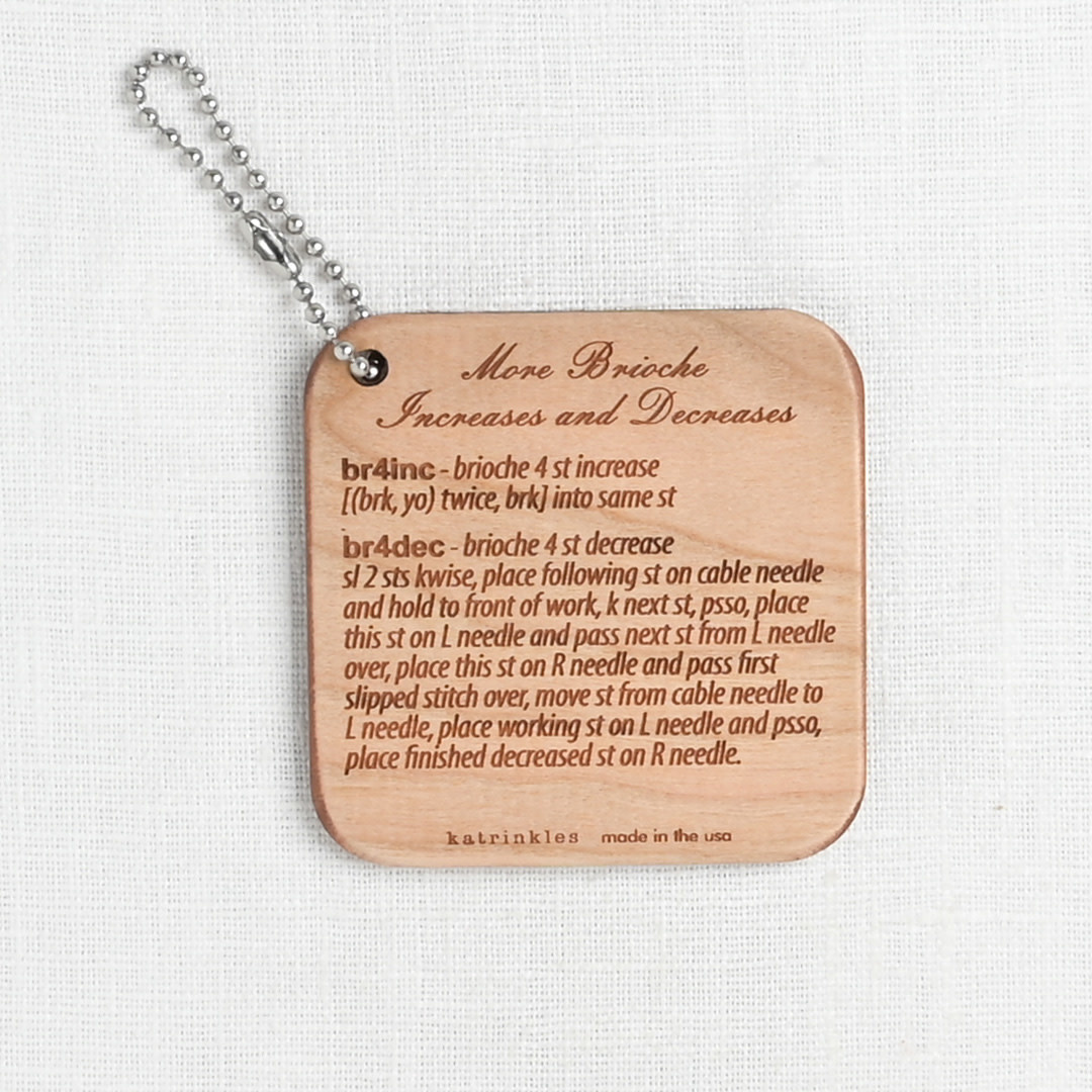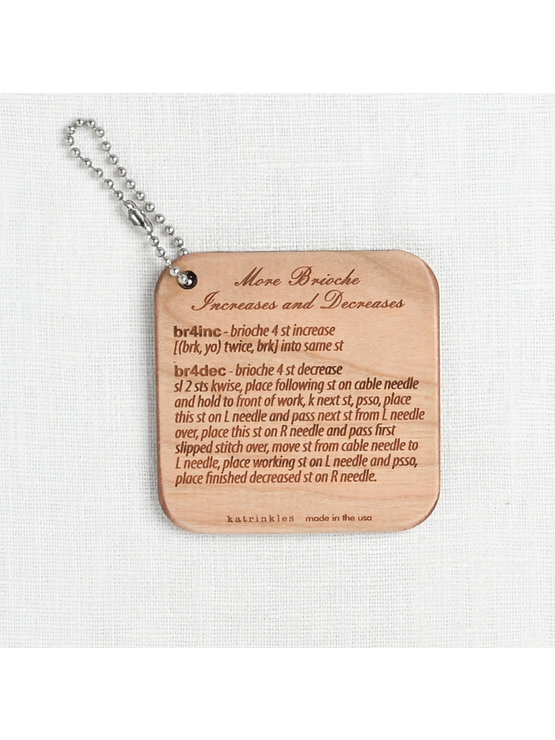 Quick & useful knitting technique instructions at your fingertips! Perfect for every notions bag, this handy wood fob is printed with instructions for a brioche 4-stitch increase, as well as a 4-stitch decrease. Accompanied by a bead key chain.