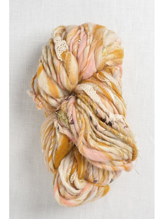 Inspired by Knit Collage’s love of daisy chains & flower crowns, Daisy Chain is a wool yarn spun with bits of tea-dyed lace, Jaipur fabric & daisy trims.  If that is not enough, each skein has bits of sparkle to make the yarn even more fun & interesting.  A gorgeous & unique yarn for knitting & crocheting hats, mittens, cowls, scarves, cardigans & ponchos.  The yarn also works well as an interesting addition when knitting with other yarns.