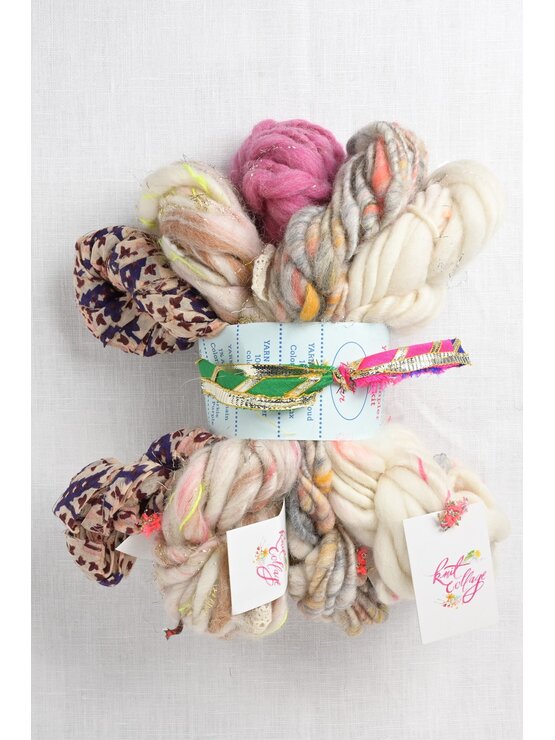 Have fun mixing & matching colors & textures to knit your own unique personal creation.  Very boho chic, the set contains mini skeins of 5 different Knit Collage yarns.  The sets are available in different color options & arrive ties with an embellished ribbon from the founder’s travels to India.  Includes one mini skein of each of the following yarns: Spun Cloud, Wildflower, Daisy Chain, Cast Away & Dreamland.