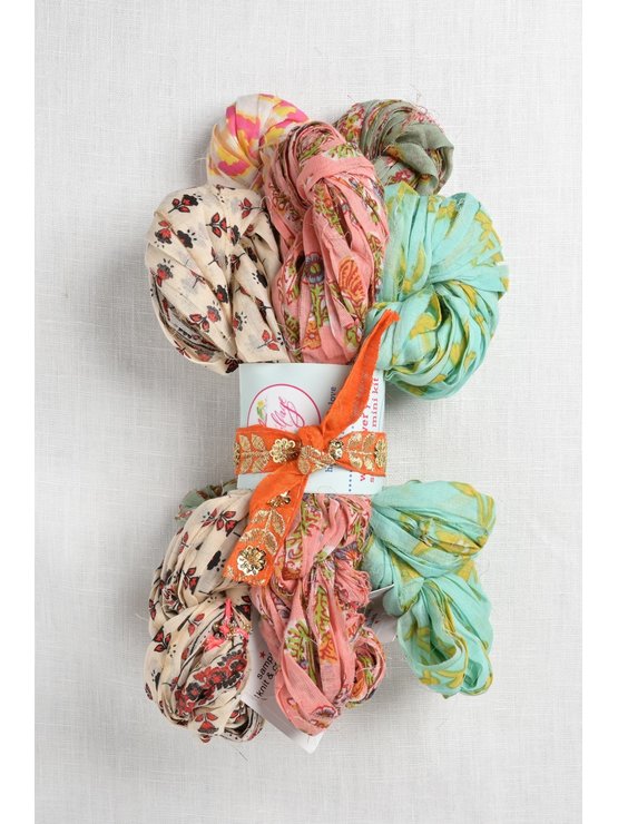 Wildflower is a very unique “yarn” in that it is hand made from strips of soft, cotton voile fabric!  The fabrics are printed in traditional Indian paisley & flower designs paired with modern colors.  The fabric is hand cut into strips & then knotted together by artisans to create each skein.  A fun choice for knit & crocheted necklaces, bracelets, market bags/baskets, & unique tops & accessories.  The fabric yarn is also fun to weave or knit into projects combined with other yarns.  It works nicely with Knit Collage Spun Cloud.