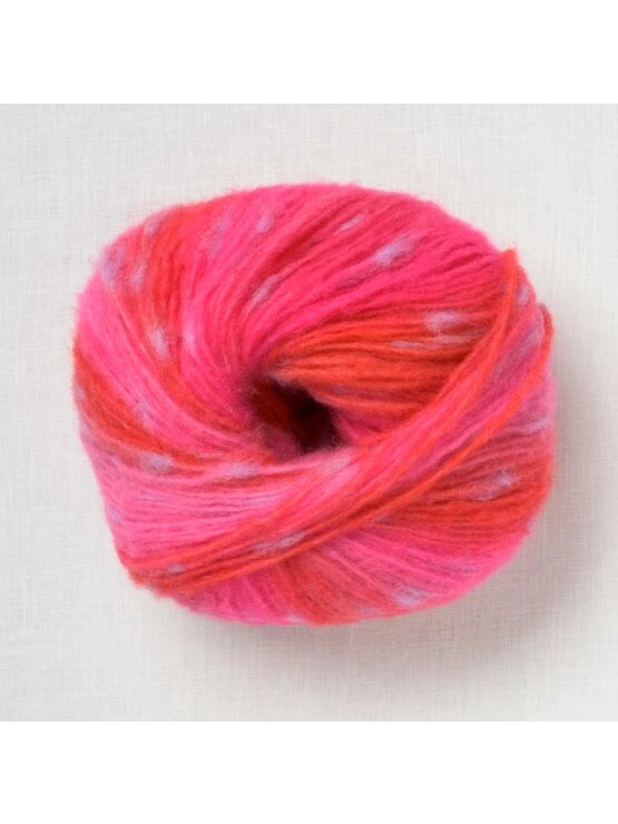 The yarn is created by binding extrafine merino wool in a nylon chainette structure, resulting in a light, airy yarn that has a beautiful halo. Each ball of Cloud Tweed is studded with soft nibs of baby alpaca that give the yarn a dappled effect. When combined with the self-striping nature of the yarn, the finished fabric is reminiscent of a beautiful animal print.