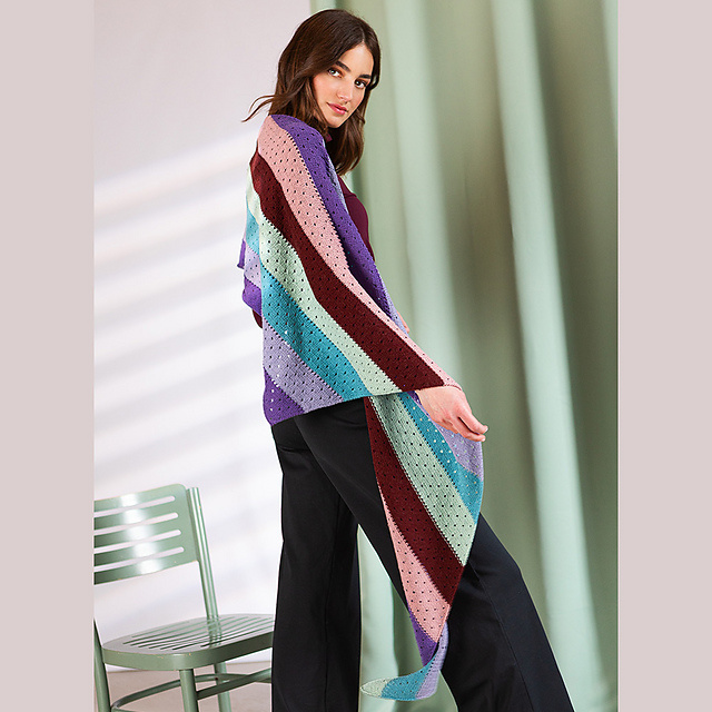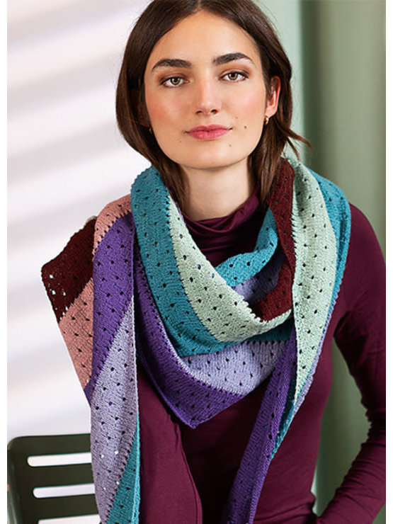 The unexpected color combination & simple eyelet pattern give the Shawl Mayra a sophisticated, fashion forward design. The asymmetrical shawl is knit from the right tip to the left edge with each row beginning with an increase & ending with a decrease.