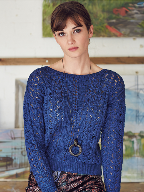 Knit this wide neck ladies sweater from the Softyak DK collection. Designed by Marie Wallin the all over lace patterning would make this design suitable for the more experienced knitter.