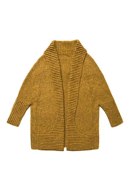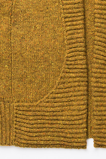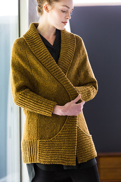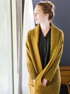 This open-front drop-yoke cardigan is the height of snuggly fashion. The brioche shawl collar, shaped with simple short rows, sweeps back to form pockets at the hem, and the sleeves begin below the elbows to create a cape-like silhouette. Tiny gutters of purl stitches trace a flattering A-line from hem to neckline within the volume of the coat. Top-down seamless construction makes Ronan a straightforward knit, and woolen-spun Shelter keeps the fabric light and airy despite the generous ease and long length.